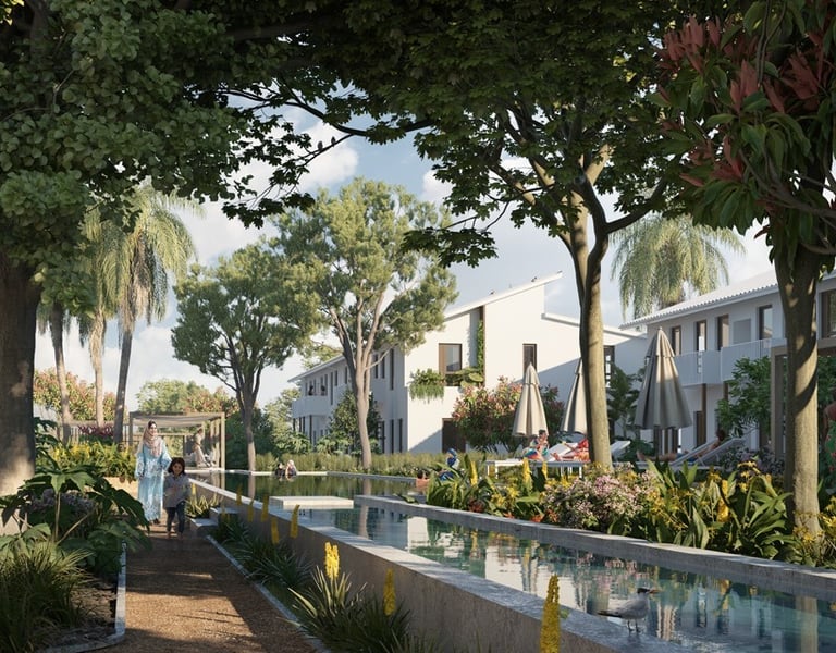 Moyoni Bay is an innovative development featuring 2 to 3 bedroom townhouses, some on a corner, built with sustainable timber. Surrounded by lush green spaces and water features, including shallow pools, swings, and sun decks, the environment offers a peaceful, nature-filled setting. The shared areas create a perfect community for families looking for a serene oasis with opportunities for social interaction.