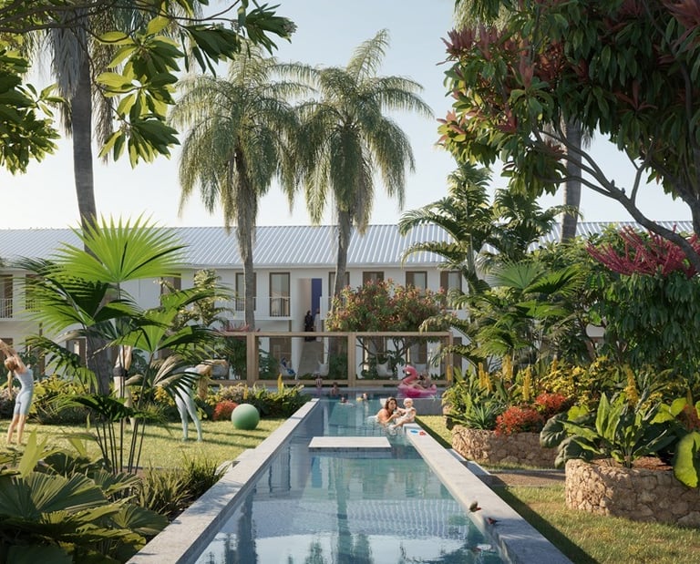 Moyoni Bay offers a truly unique, community-centered design, blending lush gardens with serene water features and multiple pools. Unlike other developments in Fumba Town that prioritise separate plots, Moyoni Bay fosters a sense of connection while maintaining privacy through vibrant greenery. Residents can enjoy tranquil garden retreats, with peaceful swings by shallow pools, sun decks, and pavilions, providing plenty of spaces to relax and unwind, socialise, and embrace nature.