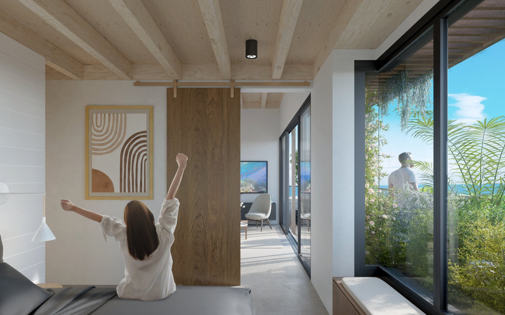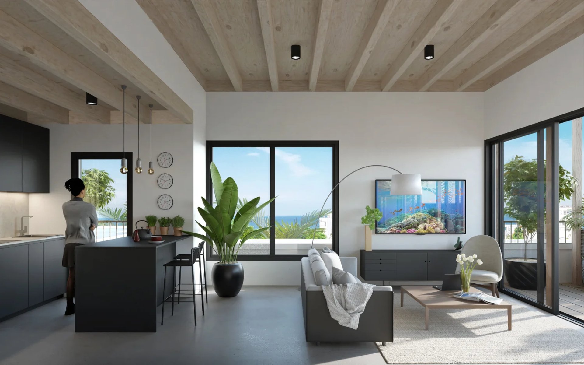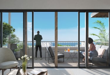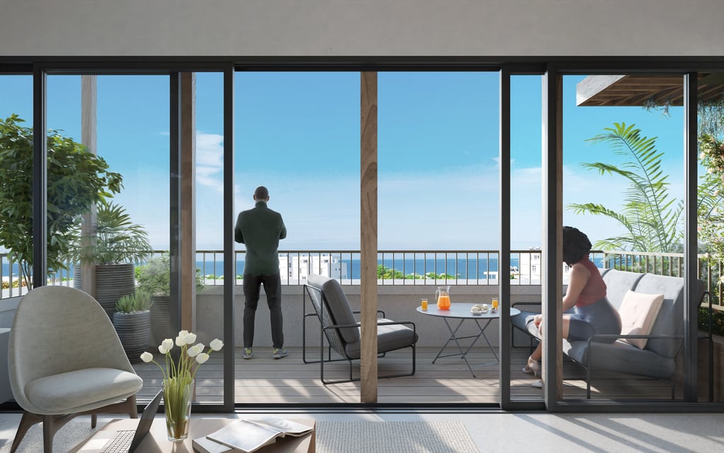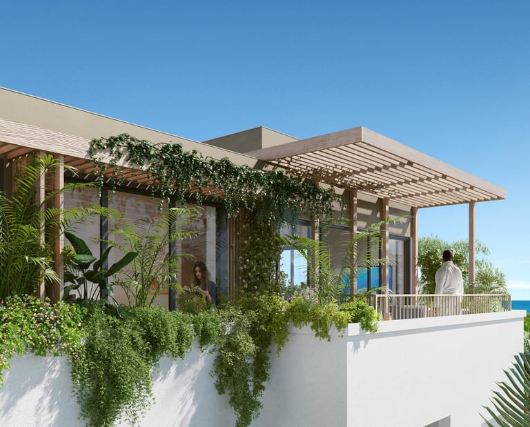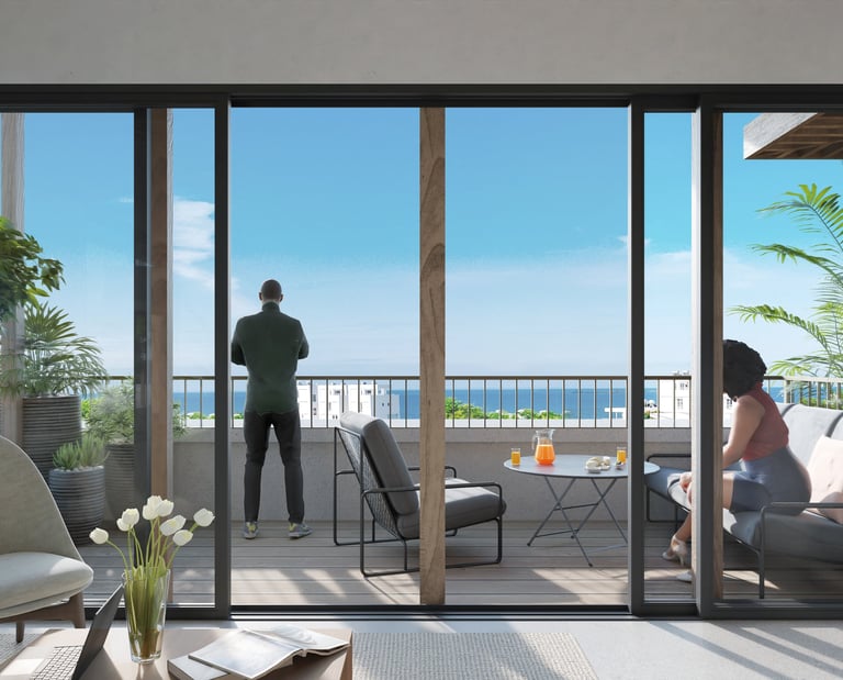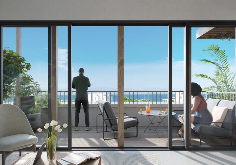 Freuen Sie sich auf ein stilvolles 1-Schlafzimmer-Apartment mit großzügiger Terrasse und eigenem Außenbereich. Bodentiefe Fenster und Dachfenster schaffen helle, offene Räume und ein besonderes Wohnambiente mit Meerblick.